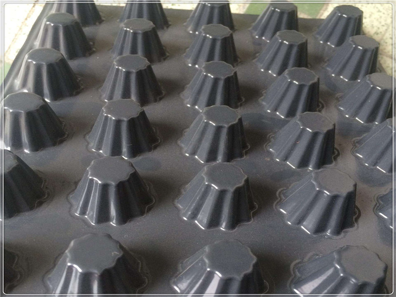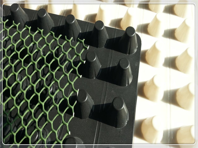利用工藝壓型在土工膜上壓出封閉突起的圓臺狀、柱狀、球冠狀殼體,形成的一種膜、殼連續(xù),具有立體空間和一定支撐剛度。結合表面鋪貼的無紡土工布濾水層。構架出架空層,利用架空層形成排水、排氣通道,同樣利用架空層達到隔音、隔振的功能。