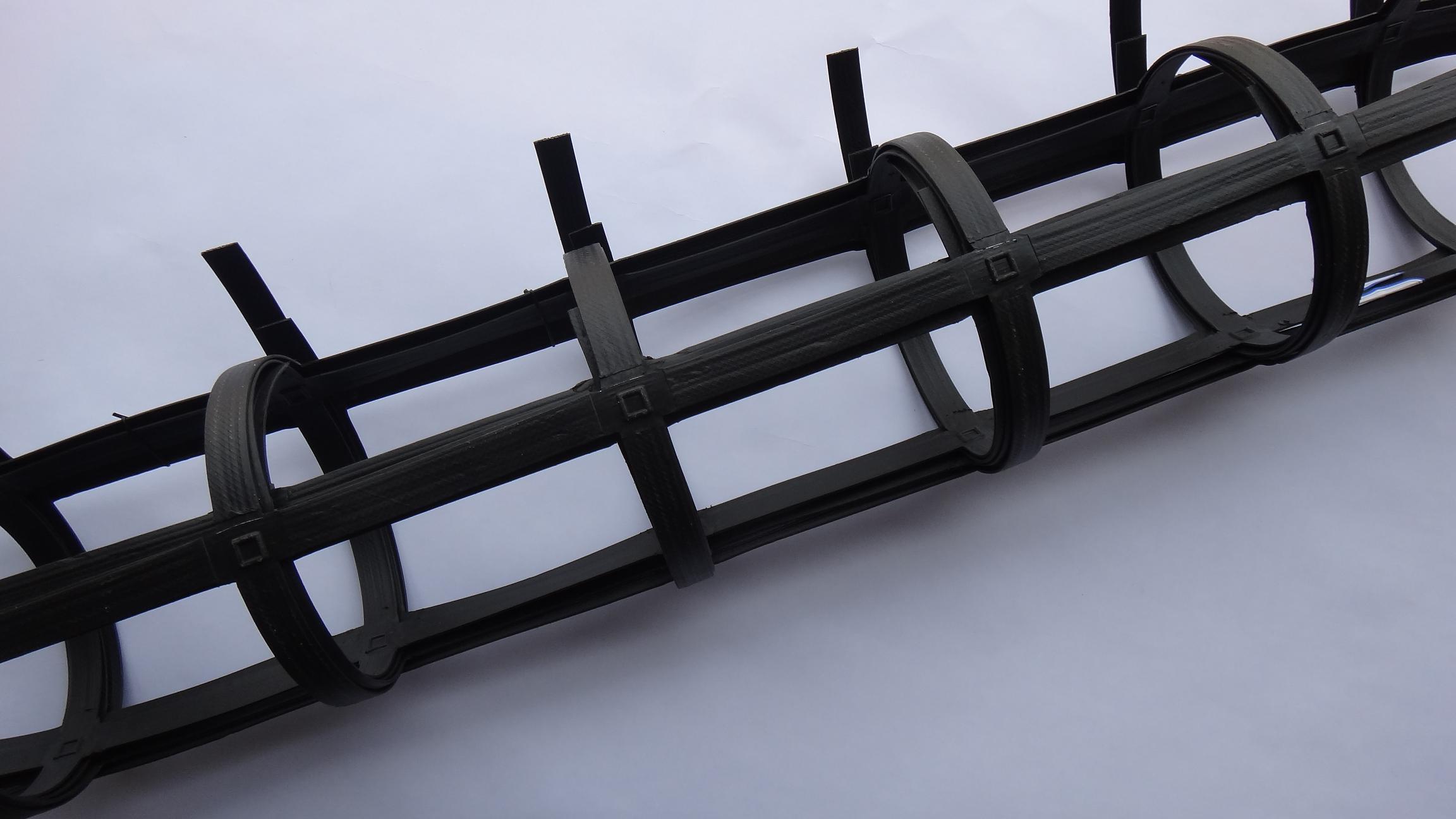 鋼塑復合土工格柵以高強鋼絲(或其他纖維),經特殊處理,與聚乙烯(PE),并添加其他助劑,通過擠出使之成為復合型高強抗拉條帶,且表面有粗糙壓紋,則為高強度加筋土工帶。由此單帶,經縱、橫按一定間距編制或夾合排列,采用特殊強化粘接的熔焊技術焊接其交接點而成型,則為加筋土工格柵。